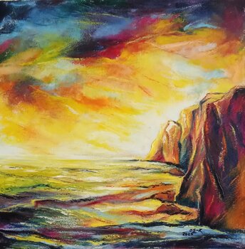 Ich wollte die rohe Kraft und wilde Schönheit der Küste zwischen dem feurigen Himmel und den majestätischen Klippen einfangen. Die leuchtenden Farben und die semi-abstrakten Formen vermitteln eine intensive, fast explosive Emotion. Dieses Kunstwerk wird Ihr Zuhause mit leidenschaftlicher Energie erfüllen – voller Leben und Geheimnis, ein Hauch authentischen und poetischen Ausdrucks.
