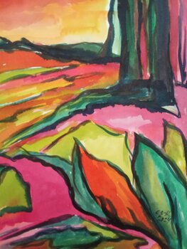 In diesem Aquarell wollte ich die Intensität eines leuchtenden Sonnenuntergangs einfangen, in dem die Farben vor roher Emotion explodieren. Zwischen Expressionismus und Semi-Abstraktion drückt jede Form und Nuance die Leidenschaft und Wärme eines flüchtigen Augenblicks aus. Ich hoffe, diese strahlende Energie erhellt Ihr Zuhause und trägt Ihre Seele zu einem Horizont voller Hoffnung und tiefer Gefühle.