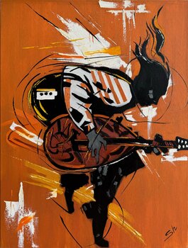 Ein Ausbruch von Rhythmus, Feuer und Bewegung – dieses Gemälde fängt den rohen Puls der Musik auf ihrem Höhepunkt ein. Kräftige Linien und explosive Farben spiegeln die Intensität einer Live-Performance wider, bei der jeder Akkord durch die Luft brennt. Die Figur beugt sich in den Klang und verschmilzt mit der Vibration der Gitarre – pure Energie, die in Form und Farbe verwandelt wird.