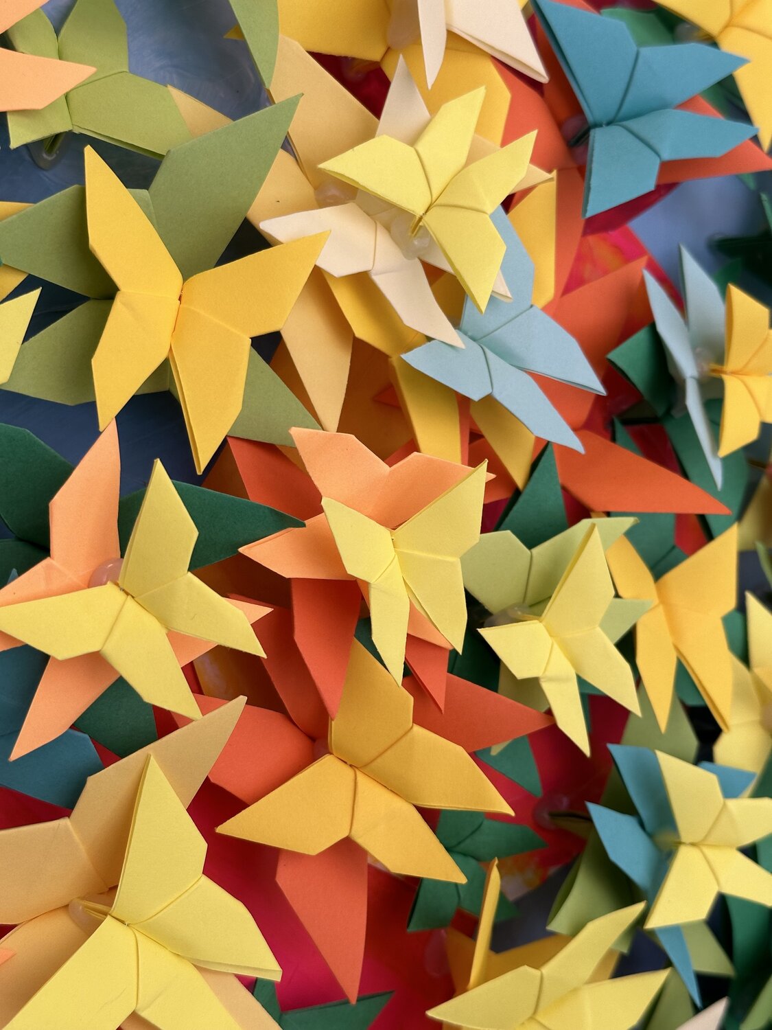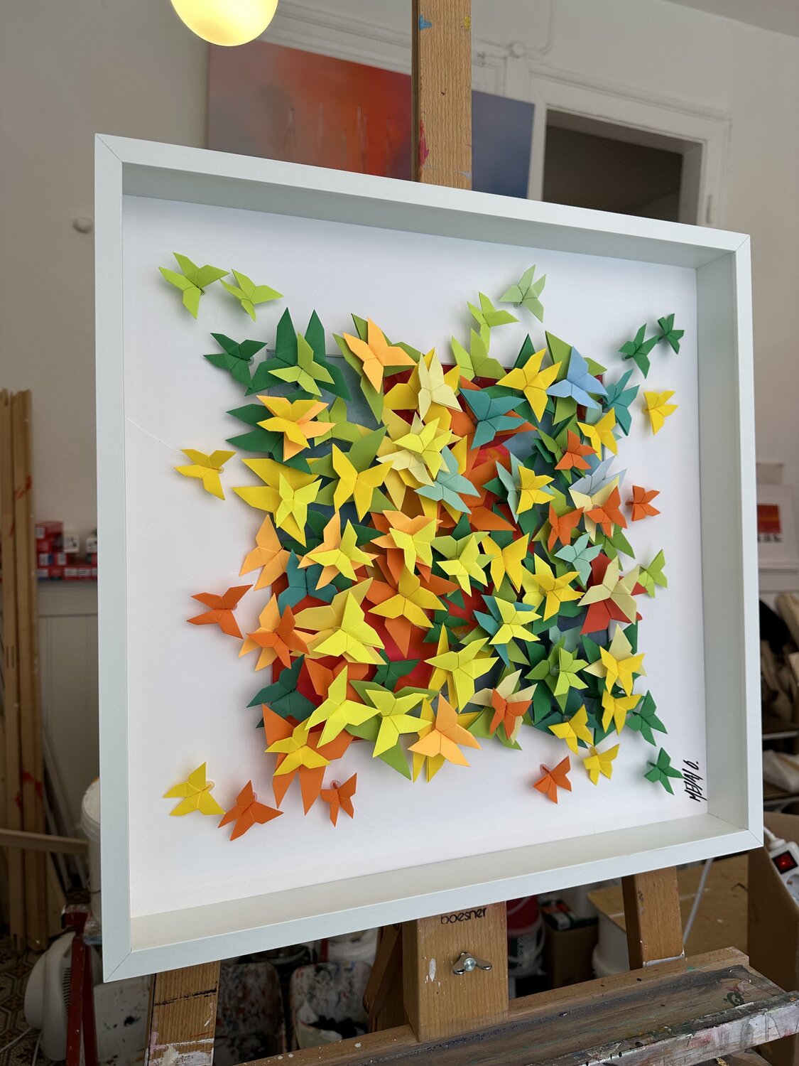 Ein Kunstliebhaber, Kauf getätigt am Dezember 2023: "Les oiseaux bleus... (ORIGAMI 2022)", Acryl, Collage auf Karton , 10,6 x 10,6 in