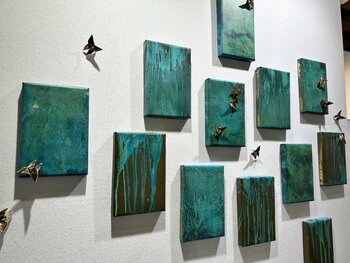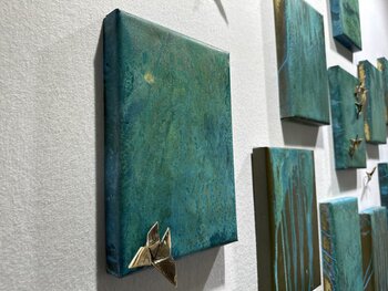 Ein Kunstliebhaber, Kauf getätigt am Dezember 2023: "Les oiseaux bleus... (ORIGAMI 2022)", Acryl, Collage auf Karton , 10,6 x 10,6 in
