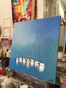 Ein Kunstliebhaber, Kauf getätigt am Dezember 2023: "Les oiseaux bleus... (ORIGAMI 2022)", Acryl, Collage auf Karton , 10,6x10,6in