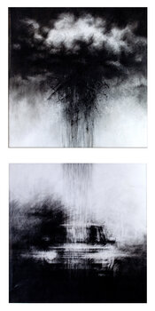 Ein Diptychon, das uns mit Kohle und Acryl auf Papier einen zusammenbrechenden Himmel und eine unvergängliche Erde zeigt. Im oberen Teil stürzt die dunkle Masse herab wie ein Gedanke, der zum Sturm wird; unten löst sich die Gestalt zwischen Geschwindigkeit und Stille auf, gefangen in einem unumkehrbaren Augenblick. Die Trennung der beiden Teile trennt nicht: Sie erzeugt Spannung, eine von der Zeit erfüllte Leere, jenen präzisen Raum, in dem sich… alles veränderte.