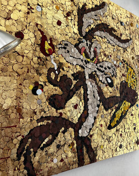 Dieses Werk ist eine faszinierende Fusion aus Expressionismus und Pop-Art, erstellt mit recyceltem Sandpapier, bemalt mit Acryl und Blattgold, einer Silikoncollage auf Leinwand. Es stellt eine lebendige Explosion aus Energie und Farbe dar, bei der die Dynamik der Comicfiguren von der Leinwand springt und die Schönheit kühner und spontaner Kunst feiert. Es soll Freude und Lebendigkeit vermitteln und jedem Raum strahlende Energie und einen Hauch von… eigenwilligem Optimismus verleihen.
