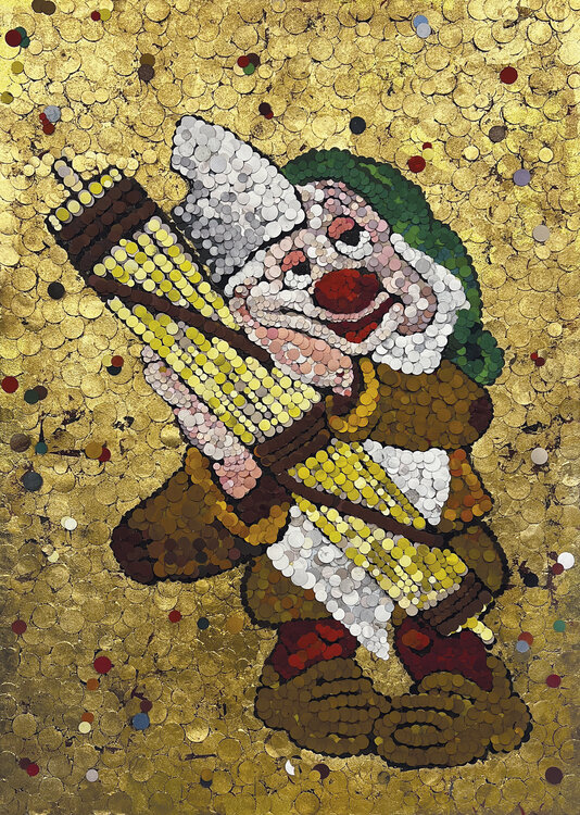 So werden Walt Disneys beliebte sieben Zwerge sowohl zur Personifizierung des heimtückischen Kapitalismus amerikanischer Prägung als auch zu… Hütern verschiedener totalitärer Regime – zwei wohlgeschliffene Seiten derselben Medaille, was wiederum weitere Ungereimtheiten offenbart. Verziert mit einem Hintergrund aus goldenen Kacheln byzantinischen Ursprungs, behält jede Figur ihre charakteristischen Charakterzüge und die klassische Filmikonographie bei, ist jedoch nicht mit Schaufeln, Spitzhacken oder Diamanten usw. ausgestattet. Pisolo hält ein Bündel Bündel wie ein Kissen in seinen Händen, in der klassischen faschistischen Konfiguration.