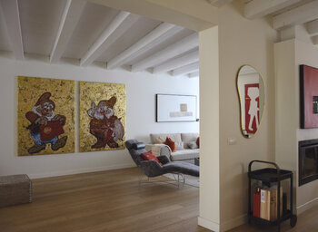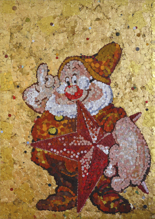 So werden Walt Disneys geliebte sieben Zwerge sowohl zur Personifizierung des heimtückischen amerikanischen Kapitalismus als auch zu den Wächtern… verschiedener totalitärer Regime – zwei polierte Seiten derselben Medaille, was wiederum weitere, in jedem Gemälde eklatante und sichtbare Widersprüche offenbart.
