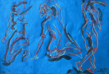 „Wo Frau ist, ist Magie“ (Ntozake Shange, Dichter) In dieser Arbeit aus Pastellfarben auf einem Blatt blauer nepalesischer Seide habe ich versucht, die Energie und die rohen Emotionen durch Expressionismus und Figurative einzufangen , mit Pastell und Walnussschale. Der leuchtend blaue Hintergrund kontrastiert mit den fließenden, dynamischen Linien, die menschliche Formen darstellen und Freiheit und Bewegung hervorrufen. Diese Kreation ist eine Hommage… an die spontane Schönheit des Augenblicks, ein visueller Tanz, der zur Selbstbeobachtung und zur Feier des Lebens einlädt. Dieses Stück verleiht jedem Raum einen Hauch emotionaler Tiefe und fesselnder Energie.