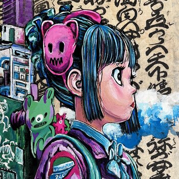 Dieses Kunstwerk zeigt ein lebhaft stilisiertes Mädchen mit surrealer Cyberpunk-Ästhetik: eine Mischung aus West und Ost. Ihr Rucksack ist eine kunstvolle Mischung aus japanischem Verkaufsautomaten und urbaner Stadtlandschaft, gefüllt mit lebendigen Details wie Getränkedosen, Spielzeugfiguren und Graffiti. Ihre Jacke ist mit bunten Aufnähern verziert, die auf Popkultur, Convenience Stores und Ikonen der Jugend verweisen. Der Hintergrund besteht aus… einer Originalcollage eines 100 Jahre alten japanischen Kalligrafiebuchs aus der Edo-Zeit, das traditionelle ostasiatische Elemente mit moderner Straßenkunst verbindet. Das gesamte Werk strahlt eine Mischung aus Nostalgie, Konsum und futuristischem Stadtleben aus.