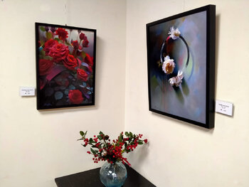 Die verschwommenen Ränder, die Farbtropfen und die tiefgrünblauen Blätter sind beabsichtigt – kleine Erinnerungen daran, dass Schönheit intensiv, aber nie vollständig kontrollierbar ist. Wenn Sie dieses romantische Blumenbild in Ihrem Zuhause aufstellen, hoffe ich, dass es dem Raum eine ruhige Ausstrahlung verleiht und Ihnen mit jedem Blick neue Facetten offenbart. – Pedro Sanz
