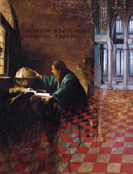 In „Vermeers Traum I“ trete ich in einen visuellen Dialog mit dem Goldenen Zeitalter der Niederlande und stelle Ikonen wie „Der Astronom“ und „Das Mädchen mit dem Perlenohrring“ einander gegenüber, um Geschichte und Fantasie zu verbinden. Mit 25 Jahren Erfahrung nutze ich vielschichtige Texturen, um klassischen Realismus mit einer modernen Vision zu harmonisieren. Die lateinische Inschrift – die mehr Geist als Körperlichkeit ausstrahlt – offenbart… die Seele des Werkes: die Suche nach dem inneren Licht, das die physische Welt transzendiert. Dieses Gemälde ist eine Einladung zur Stille und Kontemplation und spiegelt mein lebenslanges Bestreben wider, das Wesen des Seins einzufangen.