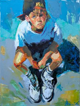 Dieses Gemälde fängt einen Moment intensiver Besinnung ein. Ich wollte den Ausdruck des Jungen mit schnellen, kraftvollen Pinselstrichen wiedergeben und dabei mit Farbkontrasten und Licht spielen. Das leuchtende Blau des Hintergrunds und seines T-Shirts verschmilzt mit den warmen Tönen seiner Haut und seiner Shorts, während die strukturierten Pinselstriche Tiefe und Bewegung erzeugen. Die strahlend blauen Augen bilden den Mittelpunkt des Werkes und… laden den Betrachter zu einer direkten Verbindung ein. Das gesamte Werk ist eine Auseinandersetzung mit Farbe und Gestik und erschafft eine Figur, die trotz ihrer Statik eine starke Energie ausstrahlt.
