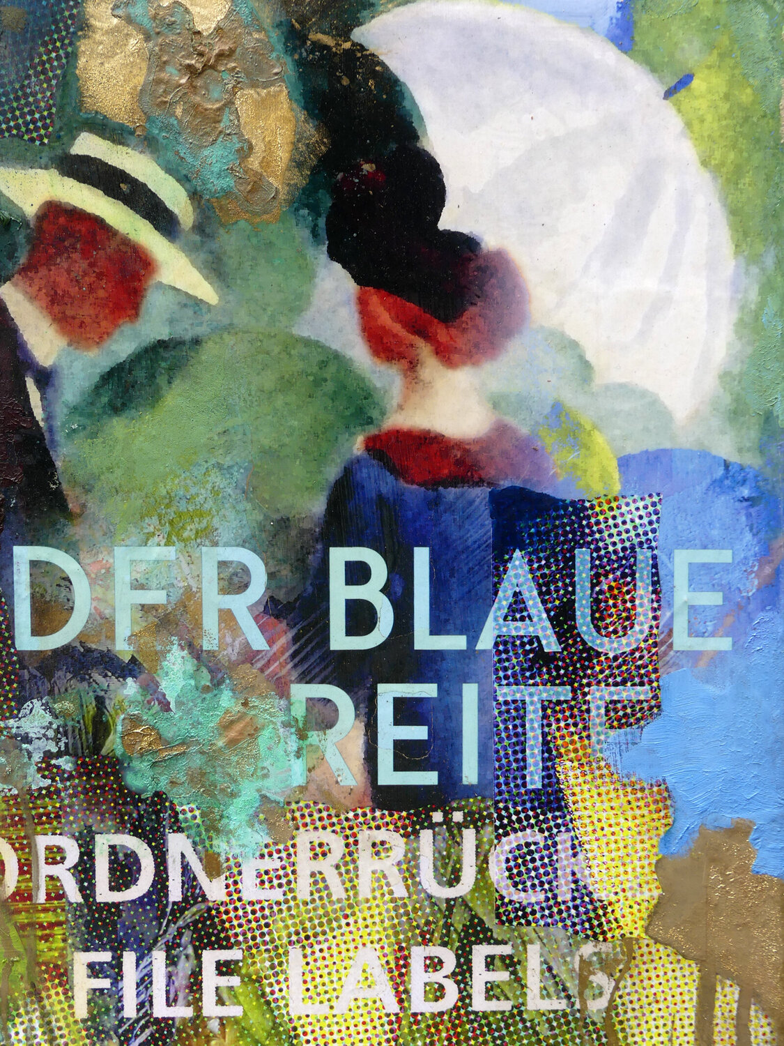 The visual language of the original works, presented as postcards from the museum shop Lenbachhaus, Munich, is partially painted over, abstracted, and re-evaluated in color using contemporary means. Peter Vahlefeld appropriates the works to demonstrate how the original images can be interpreted… through cropping and new foreground/background. Just as with the Expressionists, the aim is not to faithfully reproduce the motifs, but rather to capture a world in its fleeting, superficial appearance. Color plays an important role, then as now, in evoking an emotional impact and expressing the essence of the motifs. The colorful and gestural marks add a layer of depth and complexity to the composition.
