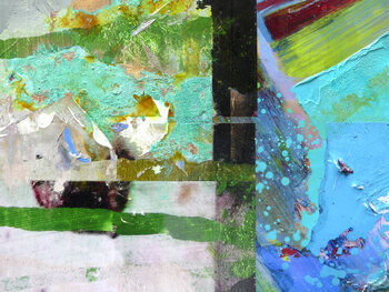 In order to achieve a subtle combination of form and content, an overpainting of printed matter that is first executed in oil on the printed page, is scanned, processed on the computer, printed on different kinds of materials, and then reprocessed and recombined on canvas. The overpainting, though obscured, is… fundamental to the picture. It is literally the starting point, and provides the structure, intersecting lines, and the relationship between forms, fabrics, pigment prints and paint. The final artwork blends all these unrelated elements that find unity in their arrangement of the painting.