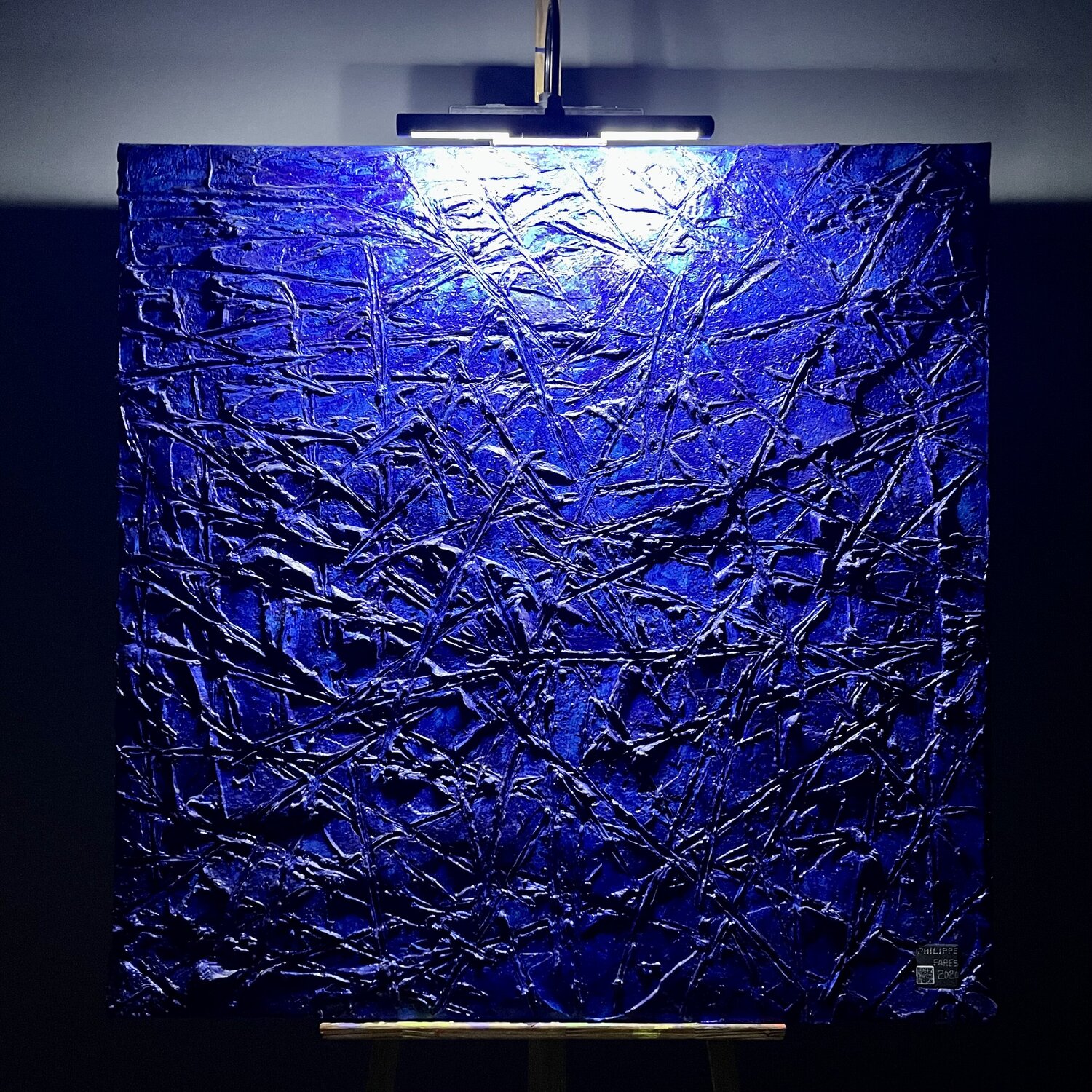 Auf einer Zementbasis hat Philippe FARES sein Gemälde blau getönt.