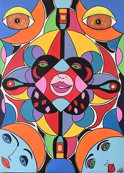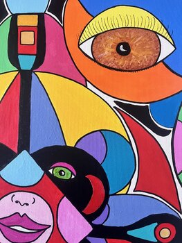 In dieser Arbeit wollte ich die Vielfalt der Perspektiven, Emotionen und Identitäten erforschen. Das zentrale Gesicht symbolisiert den Kern unseres Seins, während die farbigen Formen, die es umgeben, darstellen, wie wir uns selbst wahrnehmen und wie die Welt uns ein Bild zurückspiegelt, das mal getreu, mal verzerrt ist.