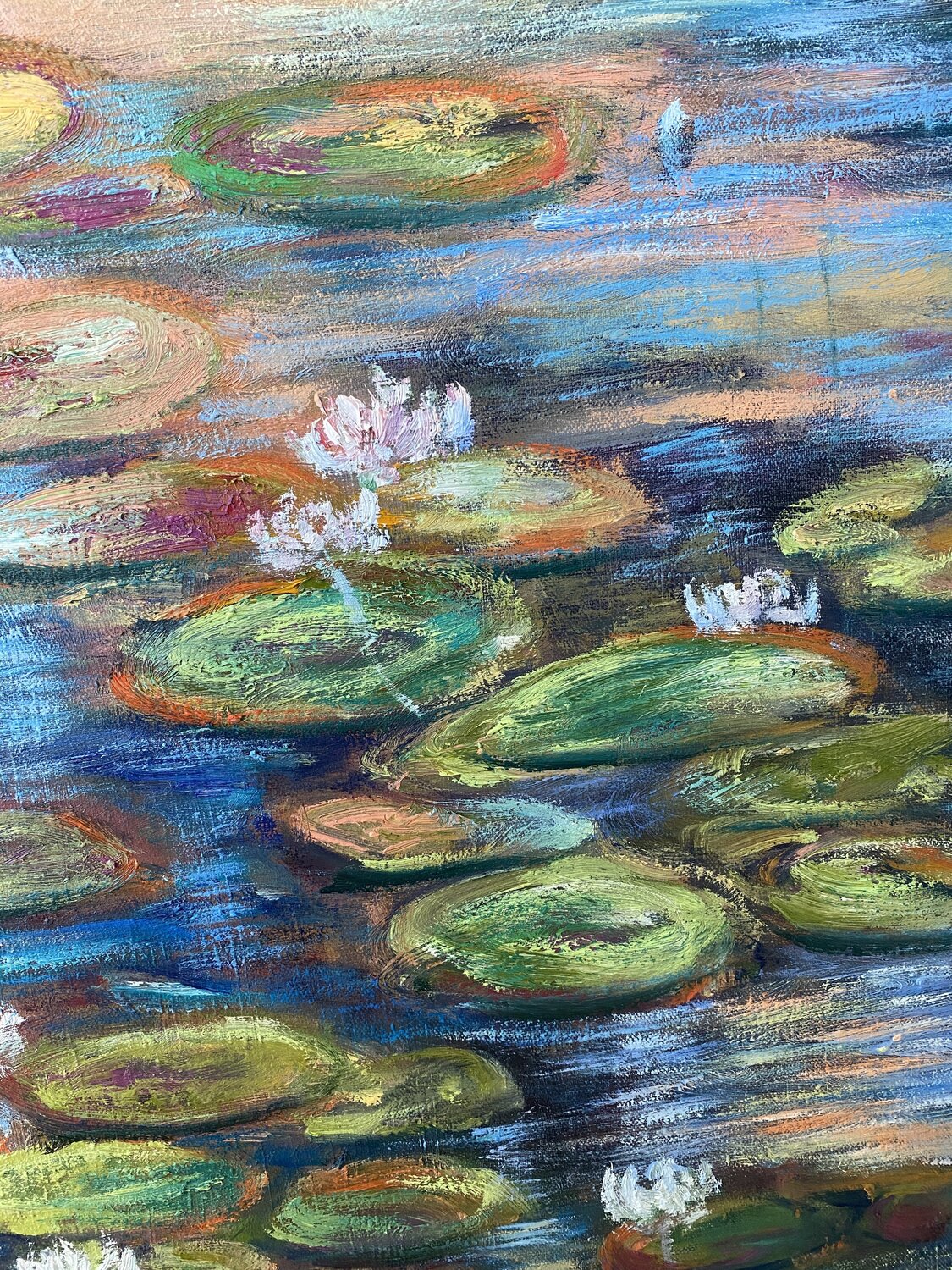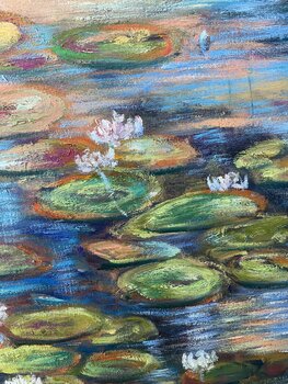 In diesem Ölgemälde wollte ich das flüchtige Spiel des Lichts auf dem Wasser einfangen. Die impressionistischen Pinselstriche vibrieren und vermitteln die Ruhe und Frische der schwimmenden Seerosen. Mein Ziel war es, eine Atmosphäre der Stille und des Staunens in Ihr Zuhause zu bringen, wo jeder Blick eine neue Spiegelung, eine neue Emotion offenbart, die beruhigt und inspiriert.