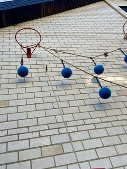 Die Bälle mit einem Hanfseil verknotet aufsteigend angeordnet soll die Erfolgsrichtung andeuten.