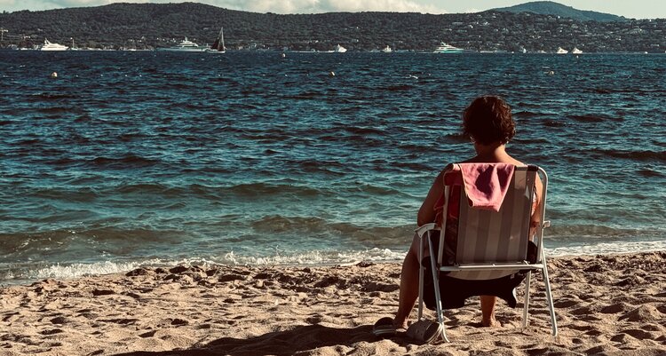 Ein Strandstuhl, ein Handtuch, viel Wasser: Mehr braucht es nicht, um einen Tag festzuhalten. Die Figur sitzt dem Meer gegenüber, als lausche sie einer leisen Erzählung. Rechts platziert, gibt sie dem Wasser Raum – Gedankenraum. In der Ferne ziehen Yachten vor der bewaldeten Küste, während warmes Spätnachmittagslicht… die Szene in ein nostalgisches Sommergefühl taucht. Das Bild verbindet Nähe und Sehnsucht, Alltag und Traum – ein stiller Moment, in dem das Schauen selbst zur Handlung wird.