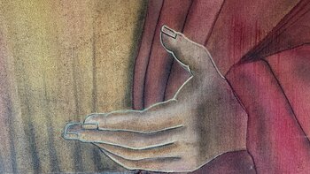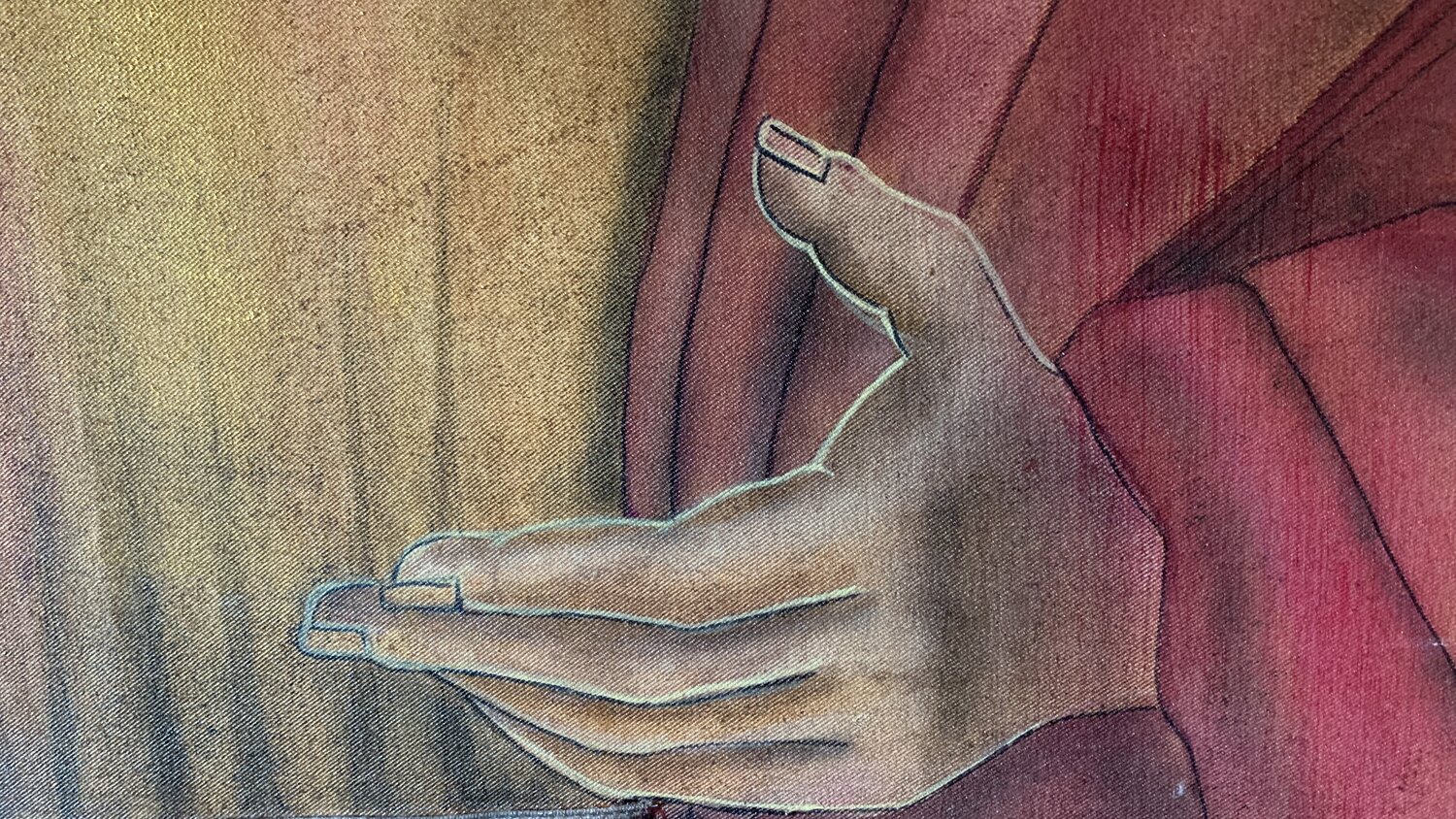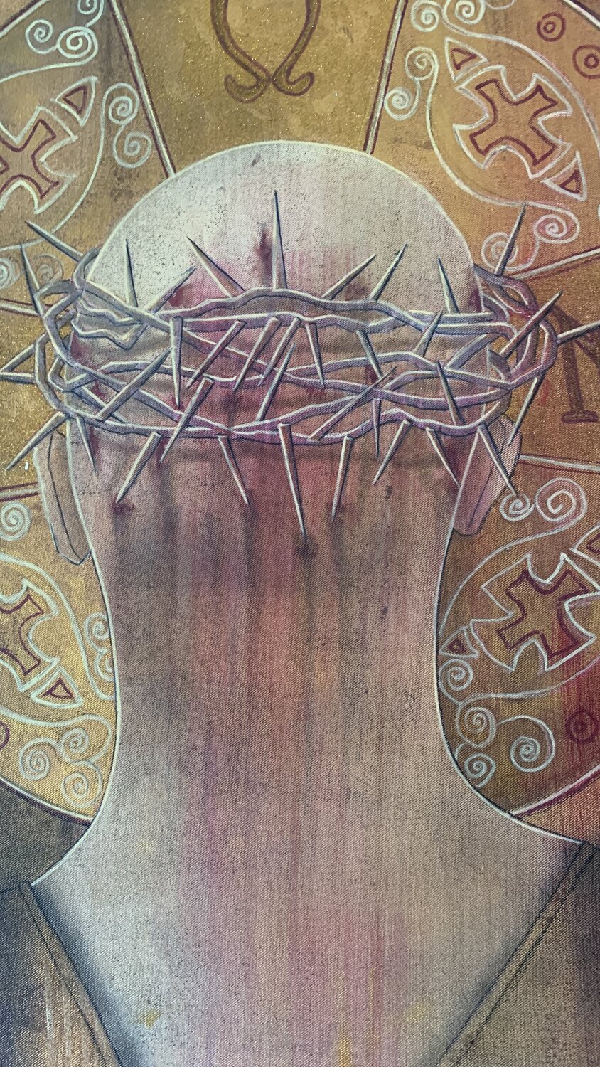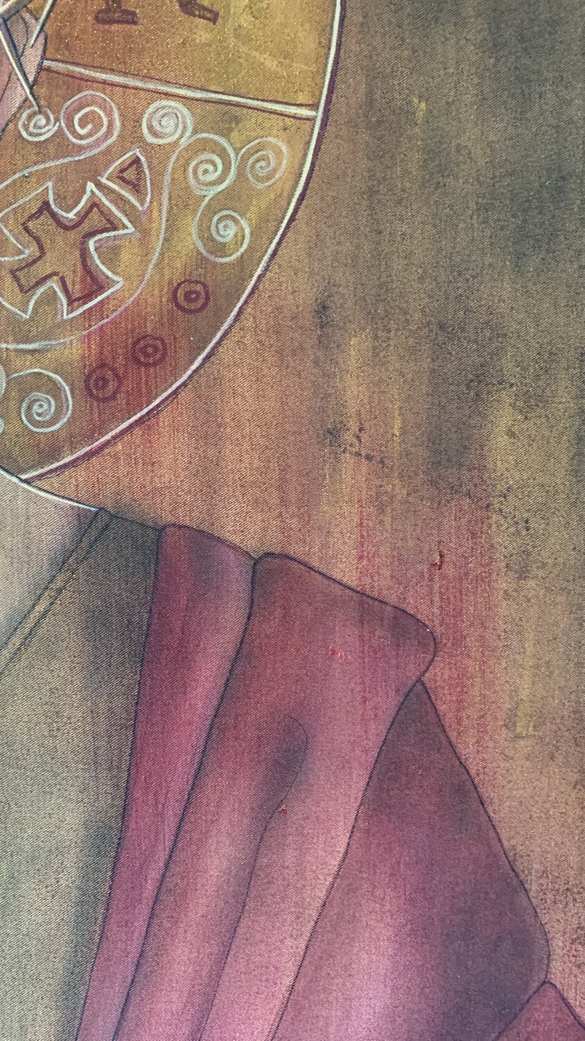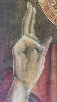 Hier ist eine Verkörperung des Zustands der Unzufriedenheit des Herrn über unsere menschlichen Zerstörungshandlungen, Kriege und Kämpfe, so dass er sein Gesicht in einem Ausdruck der Unzufriedenheit von uns abwendet, aber gleichzeitig beschützt er uns und führt… uns nach rechts Pfad durch die Gesten der Hände und das übliche Symbolsymbol.