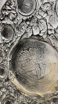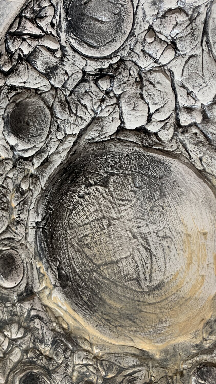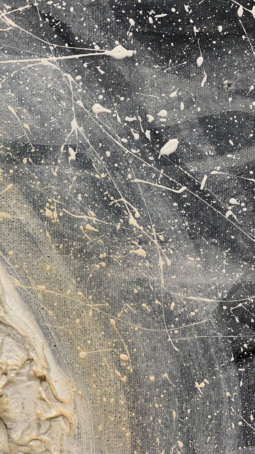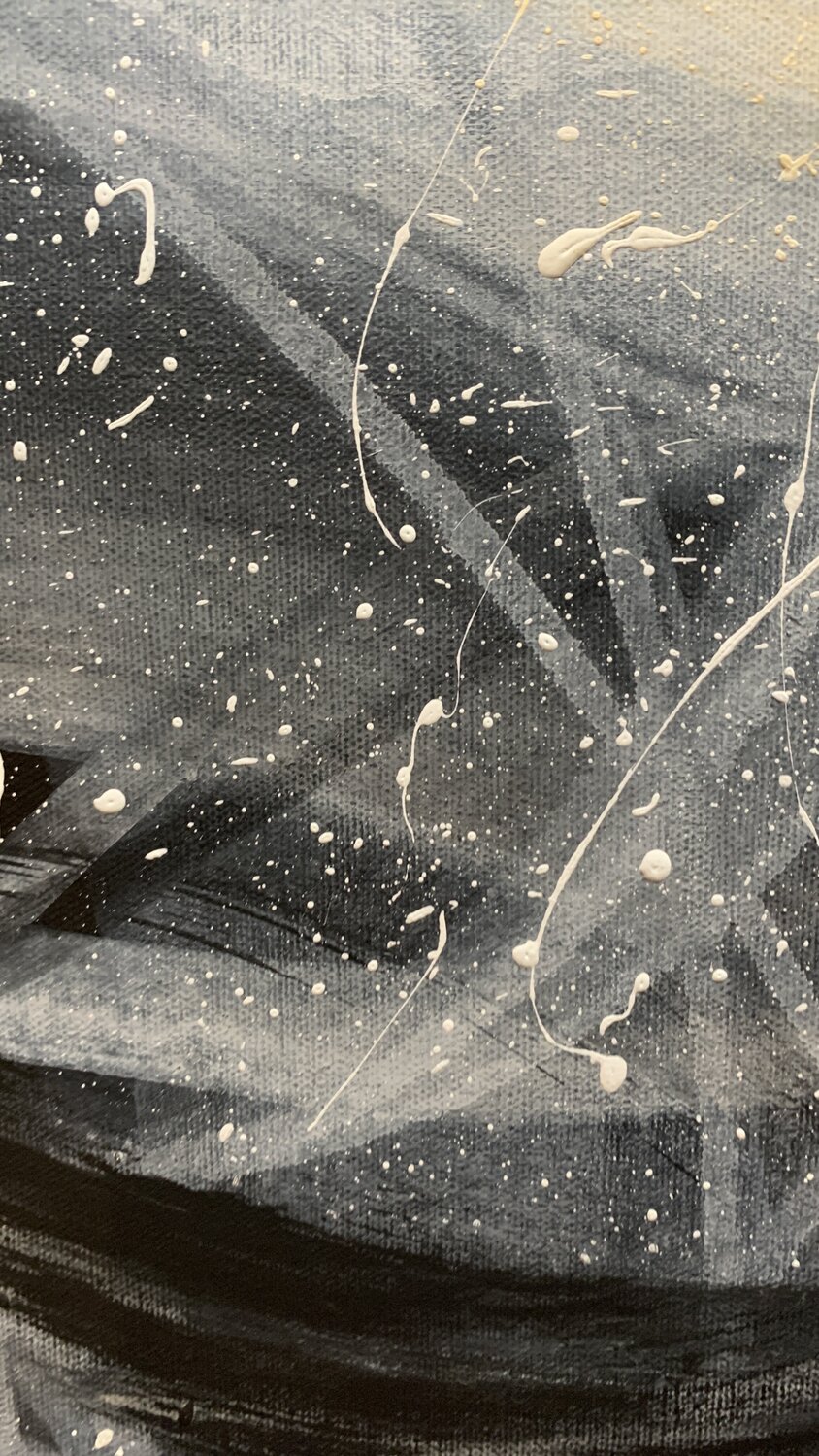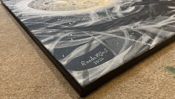 Bei der Herstellung dieses Stücks habe ich den geheimnisvollen Tanz zwischen Träumen und Realität erforscht. Der strukturierte Mond, der in einem stürmischen Äther schwimmt, spiegelt die Rohheit unserer Sehnsüchte angesichts des Chaos des Lebens wider. Die nachdenklich sitzende Krähe symbolisiert die einsame Reise des Verstehens. Diese Leinwand ist ein Portal, das Betrachter in eine Welt entführt, in der Emotionen und Gedanken ineinander greifen… und verspricht, jedes Zuhause mit Selbstbeobachtung und dem Reiz des ungezähmten Kosmos zu erfüllen.