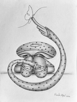 Bei der Erstellung dieses Werks habe ich die Fließfähigkeit und Verbundenheit abstrakter Formen erforscht und jede Form organisch in die nächste hineinwachsen lassen. Mein Ziel war es, ein Gefühl der Neugier und Selbstbeobachtung zu wecken und die Betrachter einzuladen, ihre persönlichen Verbindungen zu den harmonischen und widersprüchlichen Elementen zu interpretieren. Dieses mit Bleistift auf Papier realisierte Kunstwerk verbindet Elemente abstrakter… und expressionistischer Stile und erzeugt eine Dynamik, die das Auge sowohl herausfordert als auch erfreut. Es bietet eine zeitlose Präsenz und sorgt dafür, dass es in jedem Zuhause eine kontemplative, heitere Energie ausstrahlt.