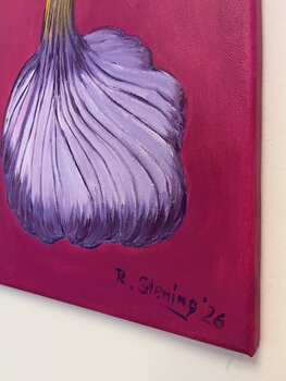 Das Gemälde „Garlic and Friends“ präsentiert eine lebendige Zusammenstellung verschiedener Gemüsesorten rund um den Knoblauch, die naturalistisch ausgearbeitet sind und dennoch, im Stil der PopArt, in kontrastreichen Farben erscheinen.