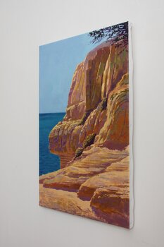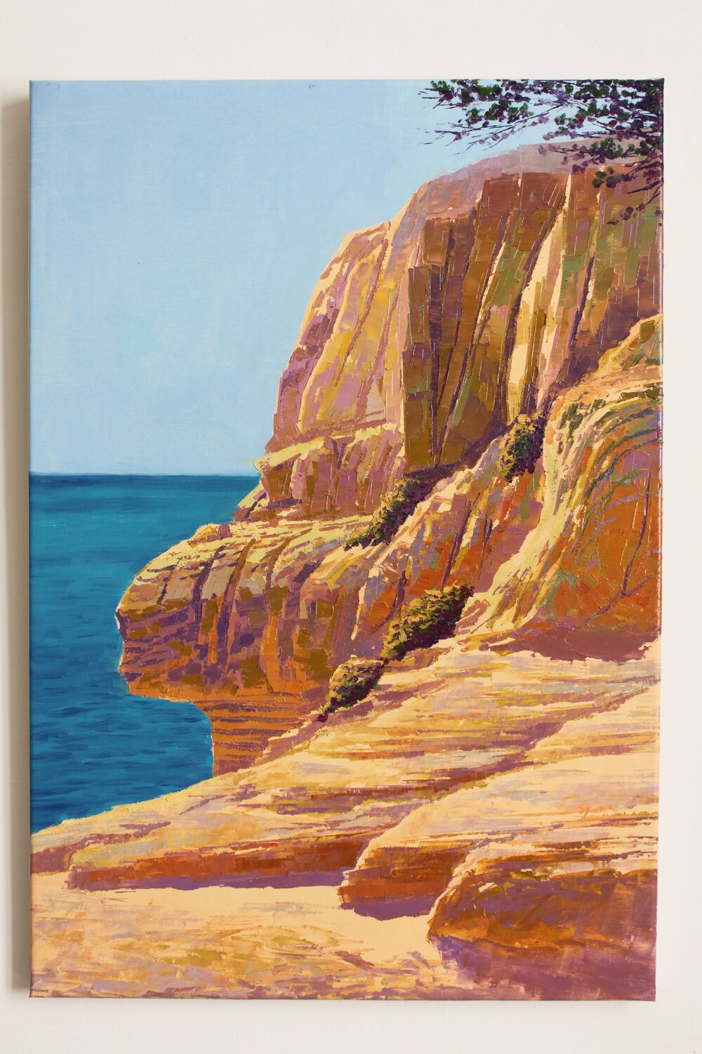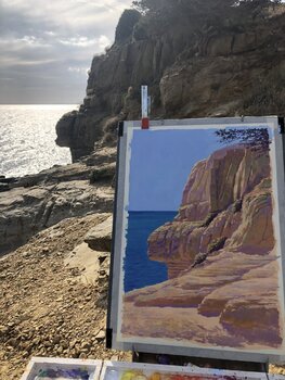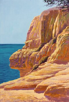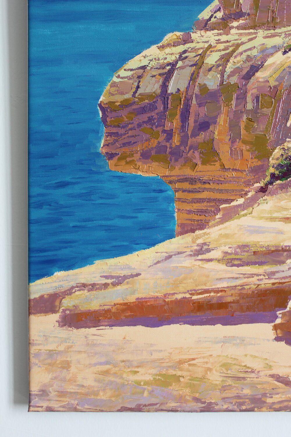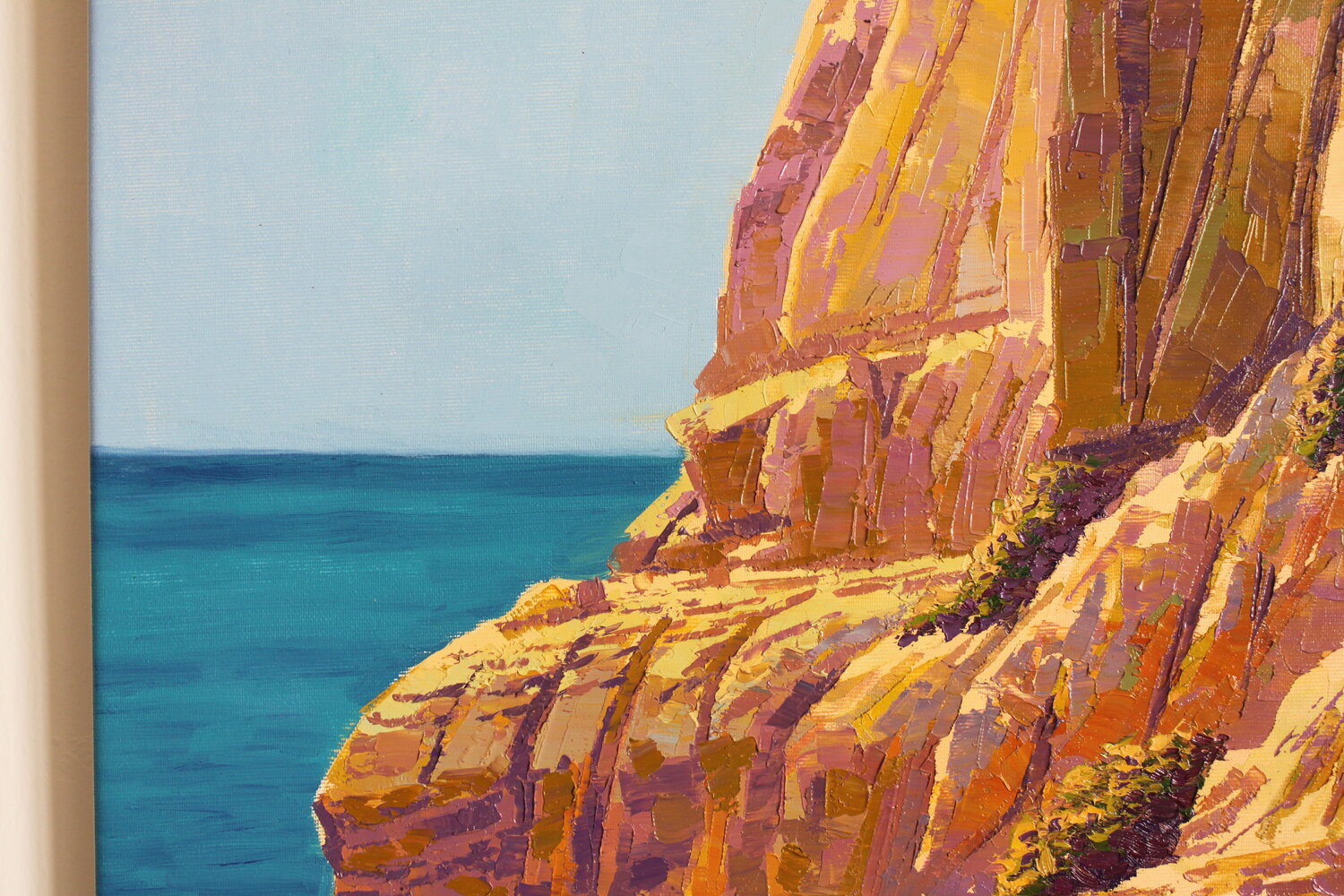 Dieses in der freien Natur an der Küste von Populonia entstandene Gemälde, gefertigt mit dem Spachtel, fängt die leuchtende Vertikalität der Klippen von Cala di San Quirico ein. Die Felsen, geformt aus warmen, pastosen Ocker-, Rosa- und Orangetönen, vibrieren im Sonnenlicht, während das tiefe Meer einen intensiven Kontrast in Blautönen erzeugt. Die Materialstruktur und die schnellen Pinselstriche vermitteln die Unmittelbarkeit des Ortes und verwandeln… die Landschaft in einen lebendigen Dialog zwischen Licht, Fels und dem Horizont des Mittelmeers.