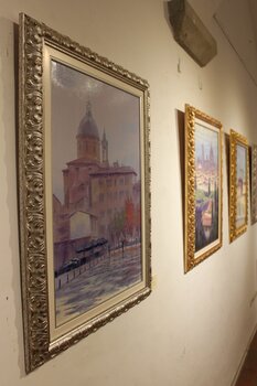 Dieses mit dem Spachtel gemalte Ölgemälde, entstanden im Freien, fängt die stille Poesie der Piazza del Carmine an einem Regentag ein. Die imposante Architektur der Basilika tritt aus violetten, rosafarbenen und beigen Farbtönen hervor, als schwebte sie in einem sanften, diffusen Licht. Dicke Pinselstriche formen die nassen Oberflächen, während Figuren mit Regenschirmen und Spiegelungen auf dem Asphalt einen feinen urbanen Rhythmus erzeugen. Die… herbstlichen Bäume und Marktstände verleihen der Szene Wärme und verwandeln den Platz in einen intimen Ort, erfüllt von Feuchtigkeit, Farben und dem Leben des Alltags.