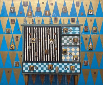 Dieses Gemälde zeigt ein reales Objekt – einen gefundenen und restaurierten Schrank, der ein zweites Leben erhalten hat. Die kleinen Fenster mit Menschen symbolisieren die Geschichten, Erinnerungen und Leben der Vergangenheit, die dieser Schrank über die Jahre hinweg bewahrt hat. Das Gemälde ist mit Ölfarben gemalt und enthält eingebettete Vintage-Fotografien.