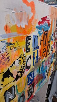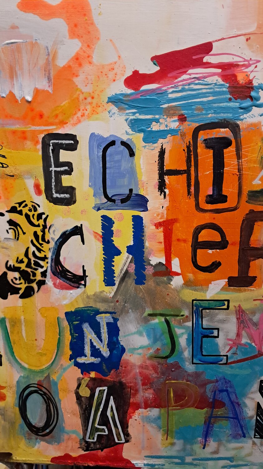 Eine Explosion von Zeichen, Wörtern und Symbolen, die auf der Oberfläche aufeinanderprallen und nebeneinander existieren. Sprache wird zu Malerei, Farbe zu Stimme.
