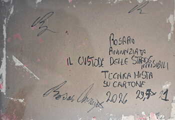Wie so oft in der Poetik des Künstlers erscheint das Bild als eine emotionale Landkarte: ein Gebiet, in dem das Chaos der Stadt, die Erinnerung an den Süden und die vulkanische Energie im Inneren zu einer einzigen malerischen Geste verschmelzen.