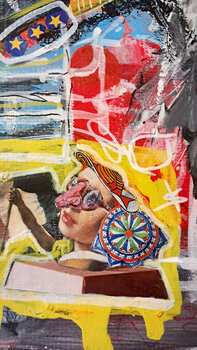 Die Komposition basiert auf starken Kontrasten: Die Collage unten, die eine fast surreale und verspielte Frauenfigur zeigt, durchbricht die starre Spannung der Uniform und verleiht der Szene eine traumhafte und ironische Dimension. Der visuelle Stil ist direkt, spontan und erinnert an Street Art. In dieser Arbeit wollte ich die Stärke und Rebellion der Menschen einfangen, die sich nicht ergeben wollen. Die leuchtenden Farben und kräftigen Striche drücken eine lebendige und chaotische Energie aus, einen Schrei des Protests und der Hoffnung. Das Werk ist eine Explosion der Emotionen.