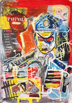 „The People Don't Sleep“ ist ein Werk, das Gesten, Schichtung und Gesellschaftskritik miteinander verbindet. Die zentrale Figur – ein roboterhafter, autoritärer Polizist mit roten, trüben Augen – repräsentiert eine entmenschlichte Macht, die unfähig ist zuzuhören. Sein starres Gesicht hebt sich von einem chaotischen, pulsierenden Hintergrund ab, der mit Schriftzügen, Symbolen und Fragmenten des Liedes „Bella Ciao“ durchzogen ist, die absichtlich… weggekratzt, gelöscht und neu geschrieben wurden.