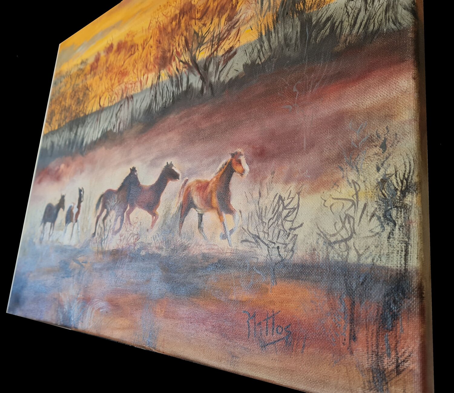 In dieser Arbeit habe ich die Essenz der Freiheit durch Ölfarbe mit realistischen und figurativen Techniken eingefangen. Die Pferde repräsentieren den unbezwingbaren Geist, der ohne Fesseln in einem Sonnenuntergang rennt, der ihre Silhouetten und den Horizont erleuchtet. Jeder Pinselstrich ist ein Seufzer der Tierwelt, eine Einladung, Freiheit vom Feinsten zu spüren. Dieses Gemälde bringt lebendige Energie in Ihr Zuhause und erinnert Sie jeden Tag… an die Schönheit der Freiheit.
