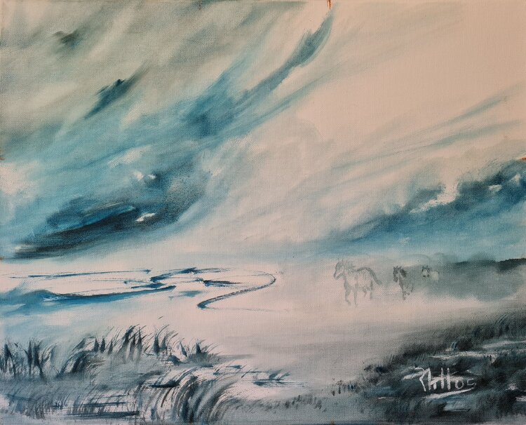 Lasst uns vor dem Sturm fliehen .... der Anführer des wilden Pferdes schlug den Takt und die dunkle Bedrohung, die sich vom Horizont her näherte. Seine Abenteuergefährten folgten ihm treu und verängstigt durch die riesigen Felder von Tacuarembó. Sie waren fast nicht zu unterscheiden zwischen dem bläulichen Staub, der vom Wind erzeugt wurde, und dieser wilden Kraft, die sie antrieb, geboren aus ihrem unbezwingbaren und freiheitlichen Geist. Sie waren… verwirrt in der Ferne der Landschaft in einem dunklen und ungezügelten Fleck. Eine einzige Kraft lag in der Luft, wo Sturm und Flucht sich zu einer unermesslichen Einheit verwandelten.