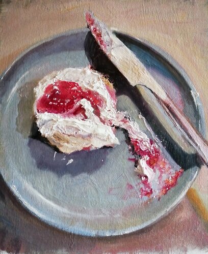 Ein Stilllebengemälde eines Cornish Cream Tea, gemalt im impressionistischen / realistischen Stil. Die Creme und die Marmelade sind lose gemalt, so dass es schwer zu erkennen ist, wo die Realität der verschmierten Ölfarbe und die durch Farbe erzeugte Illusion verschmelzen.