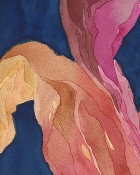 In diesem Werk habe ich die Tiefe des Aquarells verstärkt und die Rosa- und Orangetöne vor dem tiefblauen Hintergrund tanzen lassen. Die abstrakten Formen strahlen eine lebendige, atmende Energie aus – wie eine Blüte, die sich in stiller Kraft entfaltet. Es ist eine Hommage an Bewegung und Transformation, die jedem Raum, den sie bewohnt, Wärme und Dynamik verleihen soll.