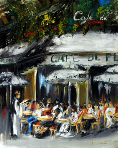 Dieses einzigartige Originalgemälde ragt mit dicker, pastoser Farbe aus der Leinwand und zeigt das bekannte Café in Paris, Cafe de Flore. Grünpflanzen und Blumen bereichern den Eingang zu diesem Café, an dessen Tischen Menschen Kaffee, Tee und Mittagessen genießen. Diese Alltagsszene ist für Schutz und Leuchtkraft in impressionistischer Lackierung dargestellt.