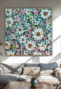 In diesem Acrylbild habe ich jede Pinselstrich mit lebendiger Energie gestaltet und kräftiges Weiß und zartes Rosa vor einem strahlenden türkisfarbenen Hintergrund miteinander verschmolzen. Die abstrakten Formen von Gänseblümchen und Blüten wecken Freude und Erneuerung und holen die Kraft der Natur in Ihr Zuhause. Das Gemälde strahlt Wärme aus und belebt jeden Raum… mit seiner dynamischen Textur und der lebendigen Blütenpracht. Ich wollte die hoffnungsvolle Umarmung des Frühlings und sein unendliches Wachstum einfangen.