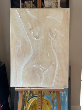 In diesem Werk habe ich die rohe Schönheit und Verletzlichkeit des menschlichen Körpers durch zarte, abstrakte Linien zum Ausdruck gebracht. Mit sanften Erdtönen und fließenden Ölfarben wollte ich ein Gefühl stiller Stärke und Sinnlichkeit erzeugen. Das Gemälde strahlt Wärme und eine intime Energie aus und lädt den Betrachter ein, sich mit dem Wesen des Selbstausdrucks und der natürlichen Eleganz in seinem Raum zu verbinden.