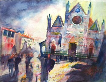 Während einer Malaktion im Herzen von Florenz malte ich die Piazza di Santa Croce mit freien, ausdrucksstarken Pinselstrichen und fing so einen einzigartigen, unwiederbringlichen Moment ein: die untergehende Sonne, als die Gebäude ihre ersten Schatten auf den Platz warfen, wo sich die Menschen auf einen Aperitif vorbereiteten. Das Werk vermittelt perfekt die in der Luft liegende Energie und Vorfreude und versetzt den Betrachter direkt nach Florenz!… Eine besondere Erinnerung an die schönste Stadt der Welt!