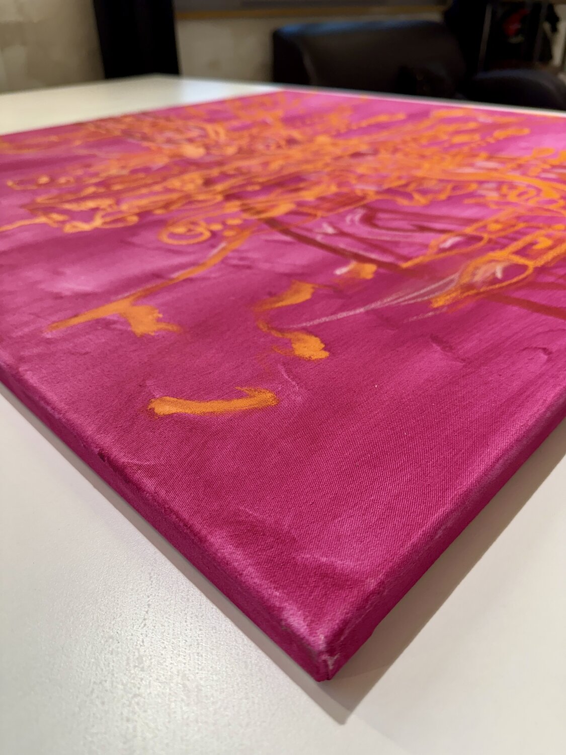 CHANDELIERS "Villa Rosso" präsentiert sich in ausdrucksstarken Farben und dynamischen Formen, Meine Kronleuchter sind Symbol für das Leben, Veränderung, Entwicklung und Zeit. Die Technik der Ölmalerei in lasierenden Schichten und Ölkreide ermöglicht eine tiefe und sinnliche Textur, die die futuristischen und expressionistischen Elemente unterstreicht. Das leuchtende Pink bietet einen intensiven Hintergrund für das opulente Orange des Kultobjekts,… welches zugleich traditionelle Pracht und innovatives Design darstellt. Das Bild mit kraftvoller und vibrierender Energie wirkt provozierend und bezaubernd zugleich. Eine spannende Mischung aus Figuration und Abstraktion. Meine Bilder sind vorderseitig und hinten signiert. Die Seiten sind ebenfalls bemalt.