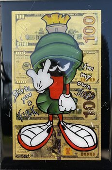 Dieses Werk wurde auf eine Holzleinwand gemalt. Der Hintergrund ist neben dem schwarz mit goldenen Dollarscheinen versehen, die je nach Lichteinfall schimmern. Diese Dollarscheine sind 24 Karat echt vergoldet. Ein Zertifikat liegt bei.