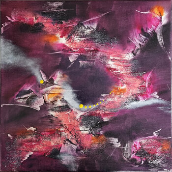 In diesem Gemälde habe ich intensive Kontraste und emotionale Tiefe durch eine meisterhafte Mischung aus Öl und Perlen erkundet. Die Violetttöne und leuchtenden Ausbrüche erinnern an einen Kosmos im Aufruhr, wobei jeder Pinselstrich und jede verkrustete Perle darauf abzielt, eine Explosion unausgesprochener Leidenschaften einzufangen. Es ist eine abstrakte Reise, die zum Nachdenken einlädt und jedem Wohnraum eine Quelle der Energie und des Geheimnisses… bietet.
