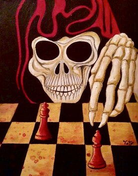 In diesem Werk wollte ich die Intensität und Spannung des letzten Augenblicks einer Herausforderung einfangen. Mit leuchtenden Farben und surrealen Formen drückte ich die unausweichliche Konfrontation mit dem Schicksal aus. Die dunkle Energie und Symbolik des Schachspiels verleihen Ihrem Raum eine kraftvolle und geheimnisvolle Anziehungskraft und laden zur Reflexion über den ständigen Kampf zwischen Leben und Tod ein. Ich schuf dieses Werk 2016,… in der Vorstellung, wie wunderbar es wäre, eine letzte Chance in einem Schachspiel mit dem Tod zu haben.