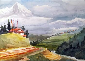 Mit zarten Aquarellstrichen habe ich die friedvolle Erhabenheit des Himalayas eingefangen und impressionistische Sanftheit mit feinen künstlerischen Details verbunden. Dieses Werk spiegelt meine tiefe Ehrfurcht und friedvolle Bewunderung für die Weite der Natur wider und lädt jeden Raum, den es schmückt, zu Ruhe und Inspiration ein. Die sanfte Energie nebelverhangener Gipfel und terrassenförmiger Felder verleiht Ihrem Zuhause eine wohltuende, hoffnungsvolle… Atmosphäre und erinnert Sie an stille Kraft und Schönheit.