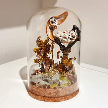 Einzigartiges Diorama-Kunstwerk aus lufttrocknender Modelliermasse, Perlen, gefärbten Spiegeln, Metalldrähten, Ästen, Holz- und Keramikresten, Metallteilen, mit Acrylfarbe bemalt und in einer 8 x 13 cm großen Glaskuppel gerahmt.