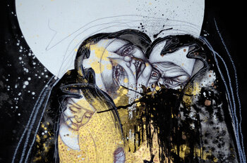 Die ineinander verschlungenen Figuren symbolisieren die Komplexität von Mutterschaft und Opferbereitschaft, eingehüllt in Symbolik und metaphysische Spannung. Jeder Strich vermittelt Verletzlichkeit und erzeugt eine eindringliche und zugleich kraftvolle Präsenz, die Ihr Inneres mit tiefer Reflexion und emotionaler Resonanz erfüllt.