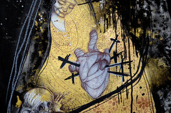 Da Tätowieren ihr wichtigstes Ausdrucksmittel ist, verbindet sie in ihrer Mixed-Media-Technik auf Leinwand meisterhaft grafische, Aquarell- und „Organisiertes Chaos“-Stile und fängt Emotionen mit Tinte, Pinseln, Kritzeleien, gebrochenen Linien und der fließenden Bewegung von Aquarellwellen auf Leinwand, Ton und Haut ein.