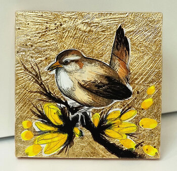 Handübertragener und handbemalter Laserdruck auf Holz, basierend auf dem Originalkunstwerk „Waiting for the Spring XVI“.